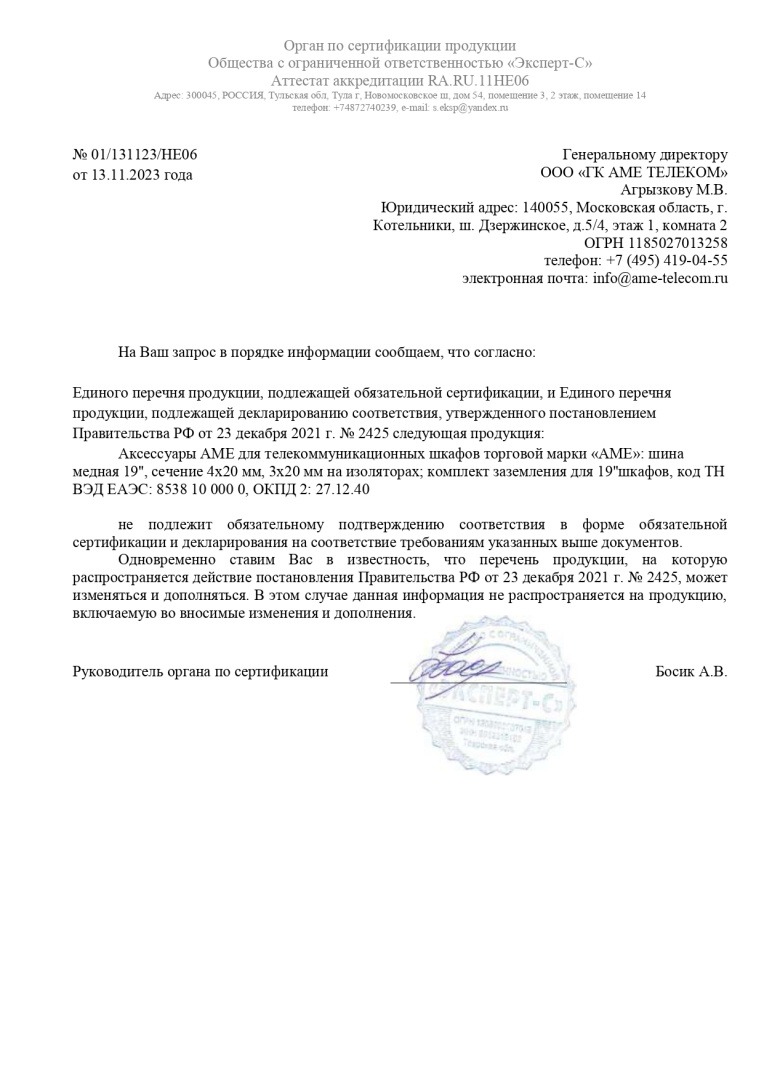 19″ сечение 4х20 мм на изоляторах, предназначена для объединения заземляющих контуров от всех токопроводящих частей шкафа или стойки, а также от установленного оборудования и для подключения внешнего заземления.