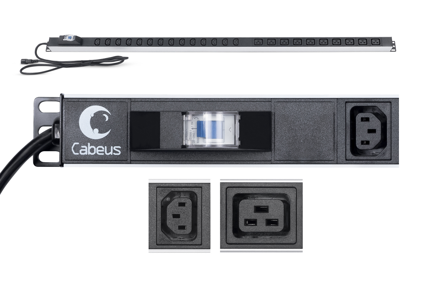 Cabeus PDU-16-14C13-10C19-B-C14 Блок розеток для 19" шкафов, вертикальный, 10 розеток IEC 320 C19, 14 розеток IEC 320 C13, 10А, автомат защиты, алюминиевый корпус, шнур с вилкой IEC 320 С14 2м