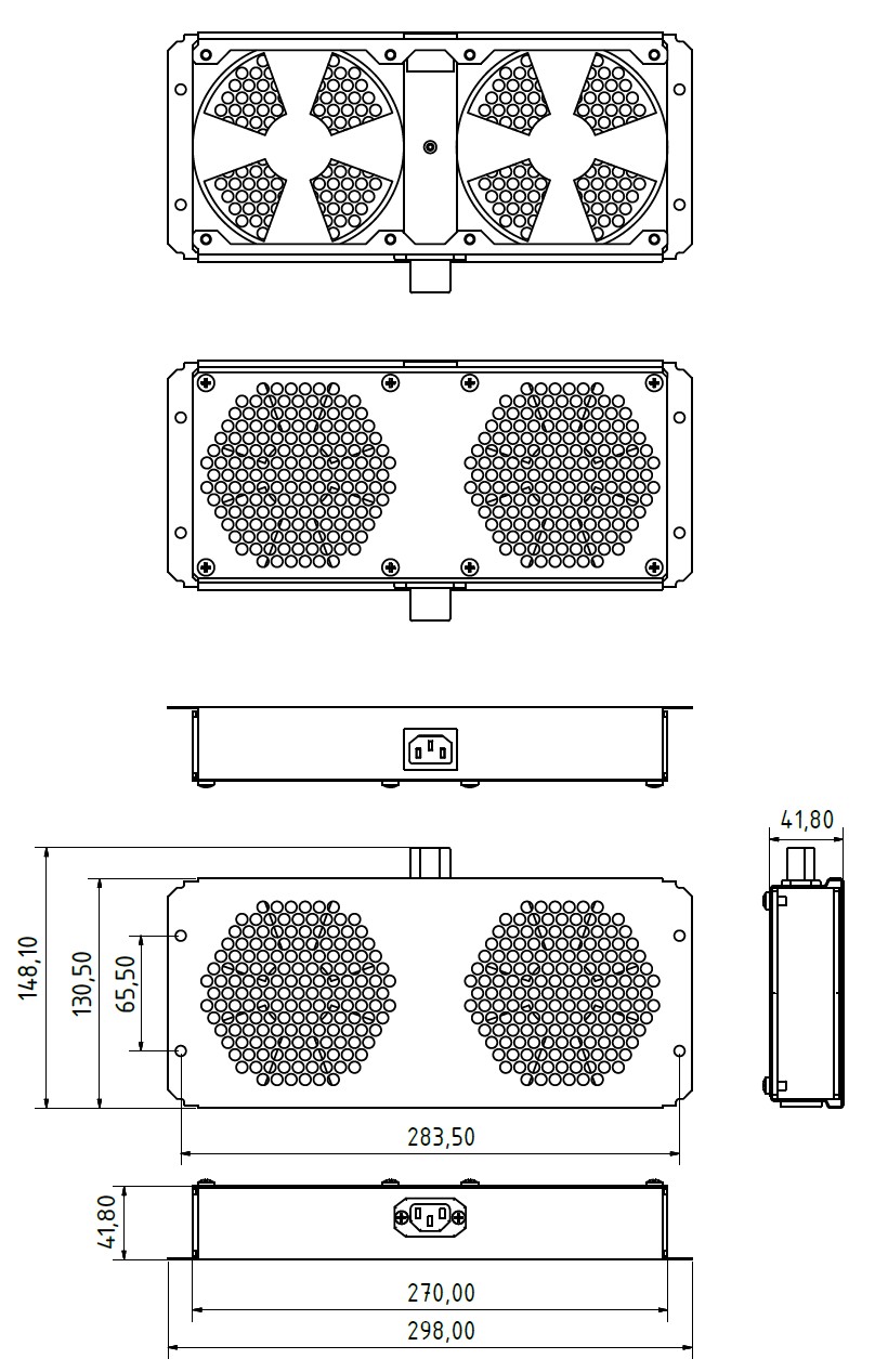 Модуль вентиляторный с двумя вентиляторами серии TFAB-T2FR предназначен для установки в 19-дюймовые монтажные конструктивы, такие как телекоммуникационные/серверные шкафы напольного или настенного варианта монтажа. Используется для установки в подготовленные отверстия в крыше или в основании шкафа в соответствии с таблицей совместимости; устанавливается после удаления выламываемых заглушек или вместо штатных фальшпанелей-заглушек; крепление производится четырьмя винтами. Изделие может также устанавливаться в другие места, подготовленные согласно размерам вентиляторного модуля, где требуется организовать вентиляцию оборудования.